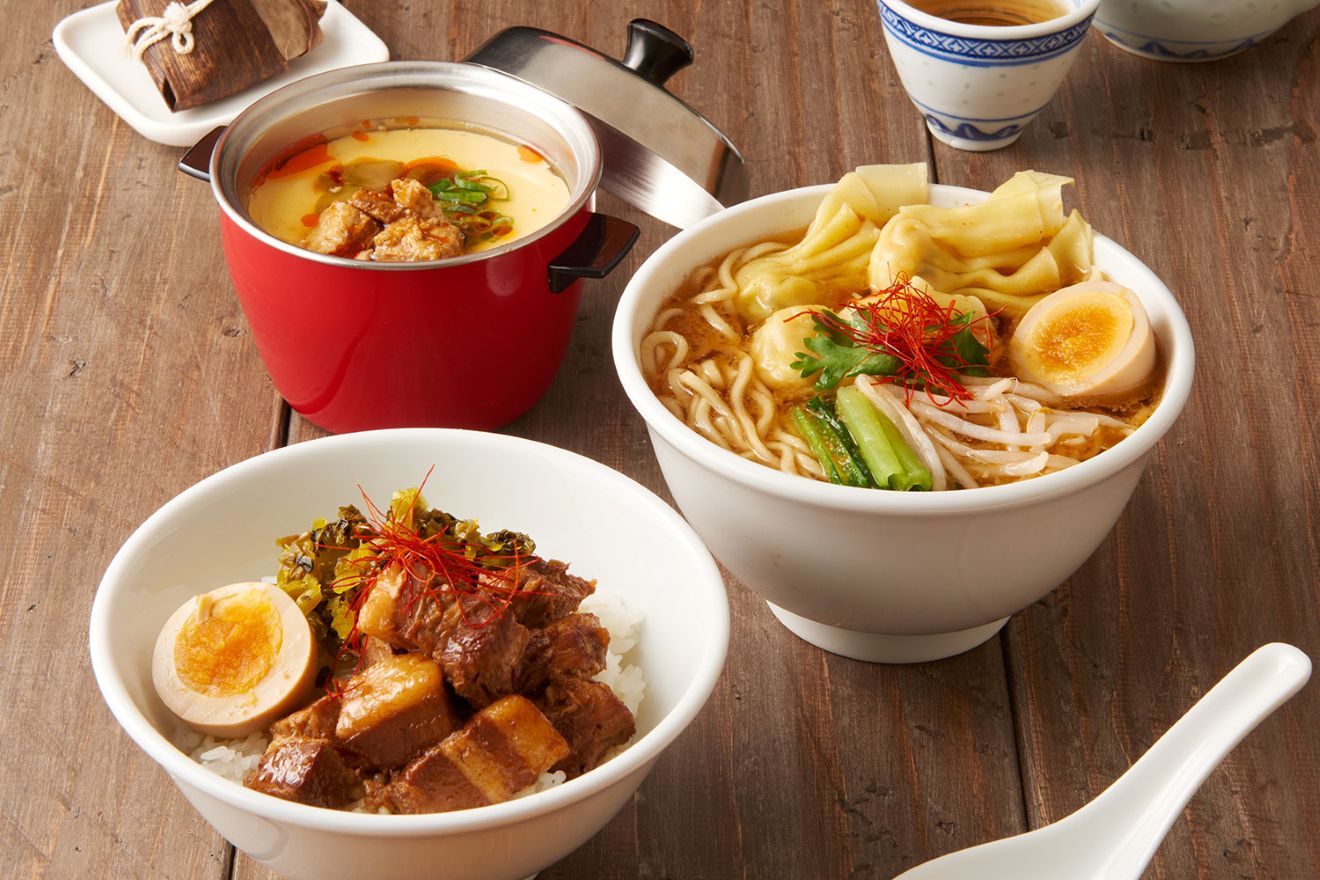▼(左奥より時計まわりで)温かい豆乳がなめらかに固まったやさしい口あたりの台湾式おぼろ豆腐「鹹豆漿(シェントウジャン)」、ぷりっとした海老の食感と甘みを包み込んだワンタンをコク深いスープとともに味わえる「台湾海老雲呑麺(タイワンエビワンタンメン)」、じっくり煮込んだ豚肉の旨みと香り高いスパイスがご飯に絡み、ひと口ごとに深い味わいを楽しめる台湾の国民食「魯肉飯(ルーローハン)」