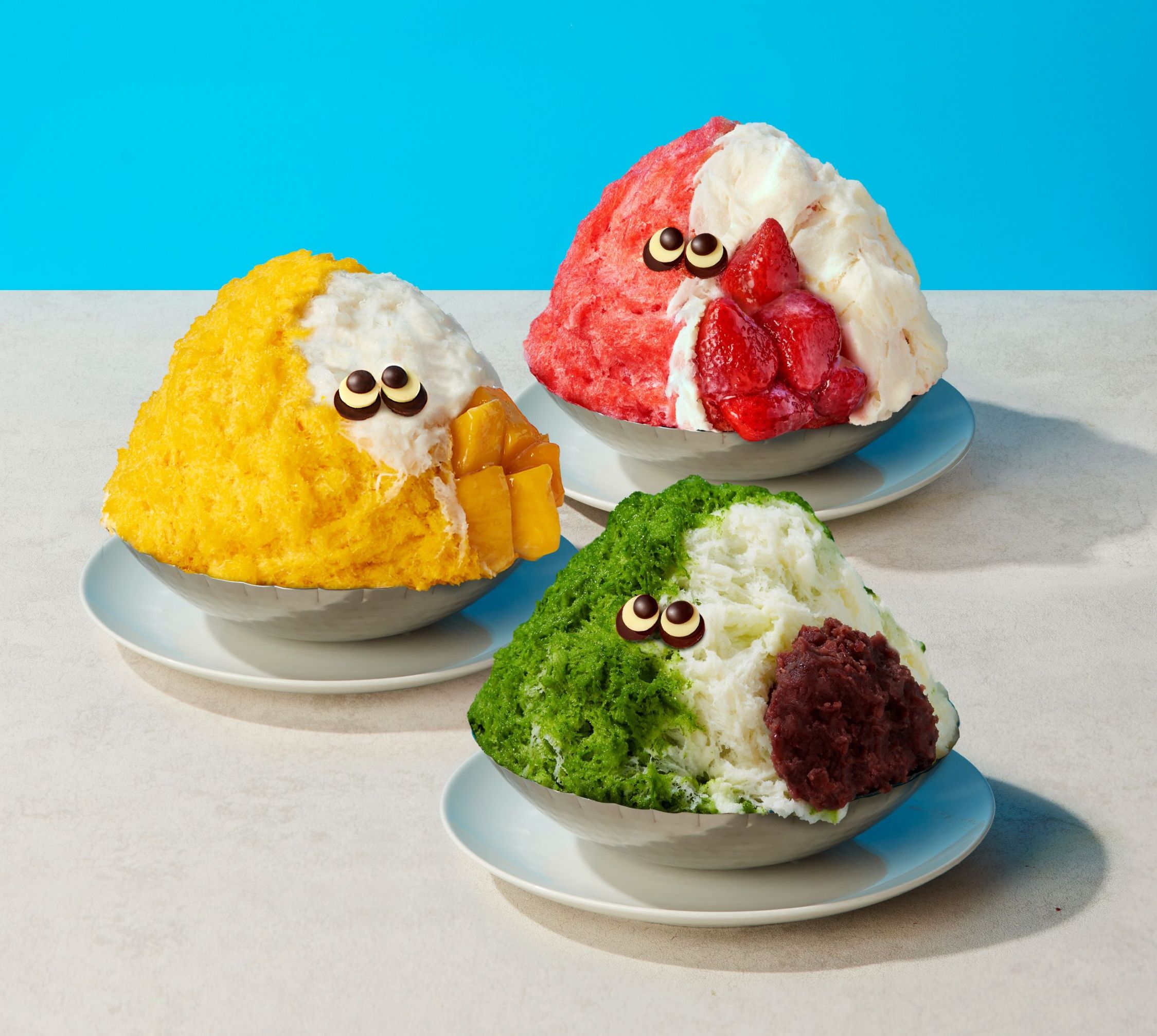 ▼フルーツ&かき氷王国・台湾からやってきた名物「キョロ目台湾雪花氷」。フレーバーは木苺・芒果(マンゴー)・抹茶の3種類。可愛いビジュアルとふわふわミルキーな食感をお楽しみください♪