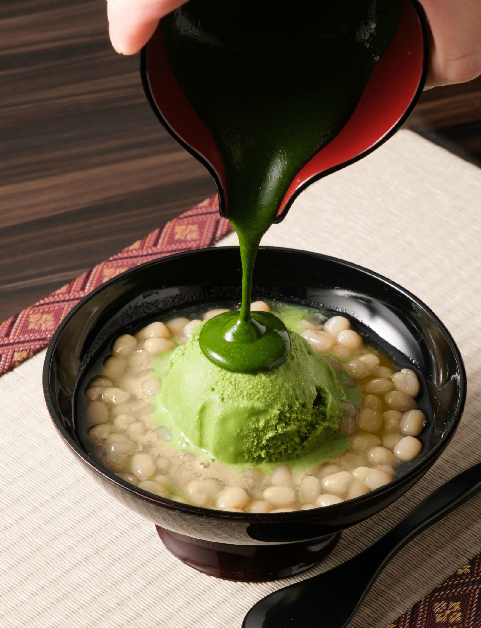 ▼希少な備中白小豆とまろやかな甘味の白ザラメ糖で丁寧に炊き上げた「白ぜんざい」に抹茶ジェラートをのせて香り高い抹茶ソースをかけた「白ぜんざいジェラートのせ」