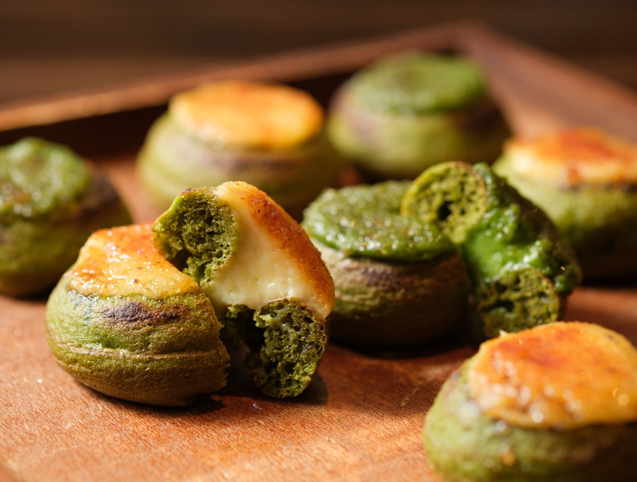 ▼抹茶ドーナツに、カスタードクリームと抹茶カスタードクリームの2種のクリームをのせ、カソナードで香ばしくブリュレ。パリッとした表面と、なめらかなクリーム、抹茶の風味が楽しめる贅沢な「ブリュレドーナツ」