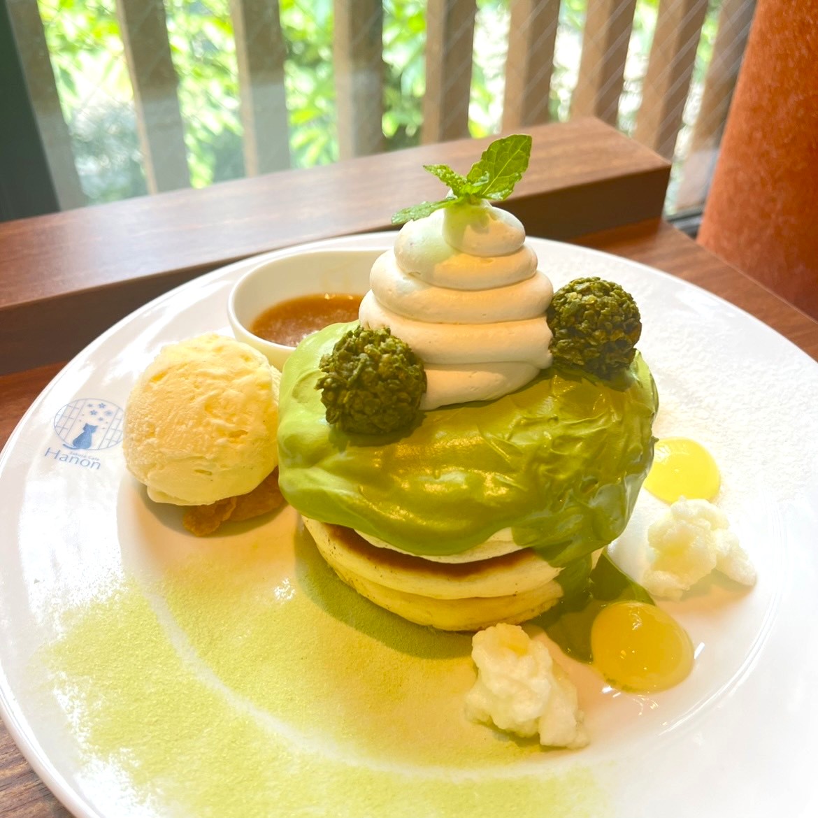 Hanonのスフレパンケーキはほんのり甘いバターミルクパンケーキ。ほろ苦甘い自家製塩キャラメルクリームと軽い口当たりの自家製生クリームの味比べが楽しい「塩キャラメルパンケーキ」や、ホワイトチョコムースとミルクに負けないくらい深煎り焙煎したほうじ茶で作る「ほうじ茶とクランチホワイトチョコのパンケーキ」、抹茶の上品な渋みと柚子&シークワーサーのさっぱりした風味が相性抜群の「柚子香る抹茶パンケーキ」(京都限定)といったデザートパンケーキから、お肉に合うお食事系パンケーキまで、豊富で多彩なラインナップが揃っています。