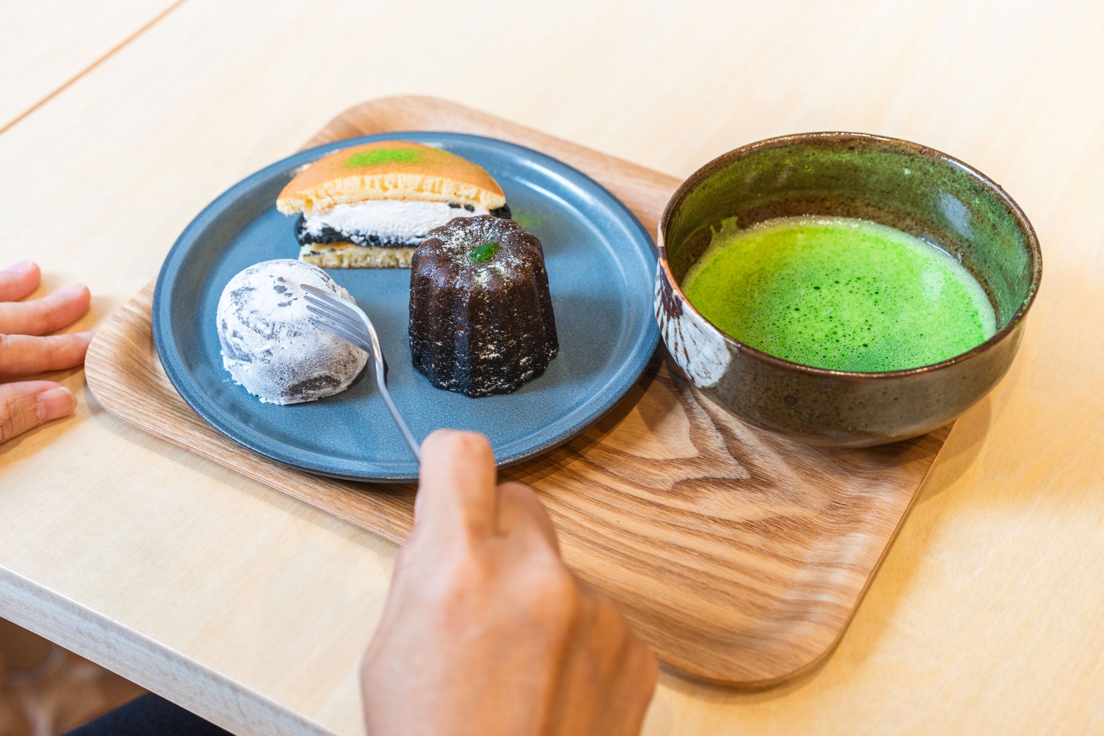 木の温もりを感じられる純和風の店内では、抹茶やほうじ茶といった日本茶をはじめ、濃厚な黒胡麻餡をもっちりとした皮で包んだ「ごま大福」、黒胡麻の香ばしさが広がる「どら焼き」、外はしっかり焼かれ香ばしく中はしっとりと仕上げた抹茶味の「カヌレ」など、こだわりの創作和スイーツを楽しむことができます。