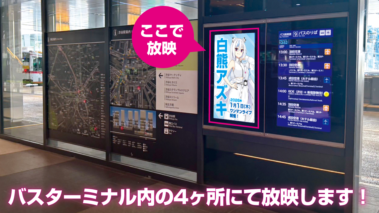 ★渋谷駅西口バスターミナル「渋谷フクラス」1Fサイネージ(4ヶ所)にてCM放映決定!