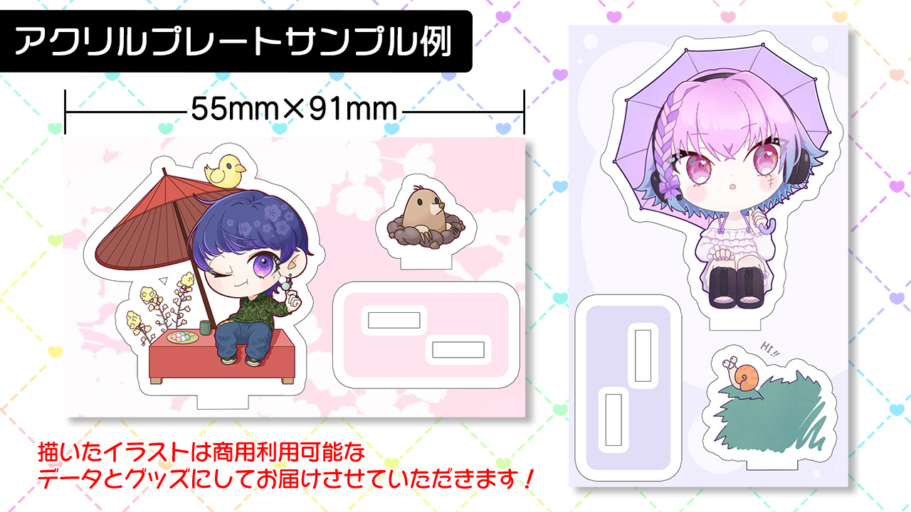 ※制作したオリジナルイラストを使用してのグッズ制作、販売等、商用利用可能です。クレジット表記も必要ありません。