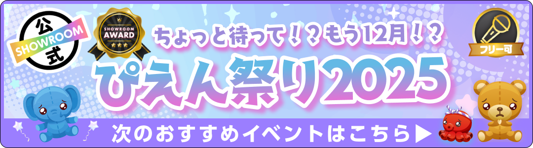 ー11/25はSHOWROOM記念日ー いつも応援してくださる皆様のおかげで、SHOWROOMは今年で12周年を迎えます! これまでの感謝の気持ちを込めて、Anniversaryイベントを開催☆ この機会に、いつもの配信や応援を通じて記念日を一緒に楽しみましょう! これまでの12年、そしてこれからのSHOWROOMを、みんなで一緒にお祝してくれませんか? ※本イベントはSHOWROOM AWARD 2025関連イベントとなります。