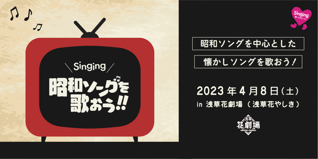 昭和ソング好き集まれ!! 2023/4/8(土)に浅草花劇場(浅草花やしき)で開催されるカラオケイベント『Singing 昭和ソングを歌おう!!』の出場者を大募集! 大きなステージと大音量、華やかな照明があなたをお待ちしています! あなたが思う「昭和ソング」を歌いながらイベントに参加してみてください♩