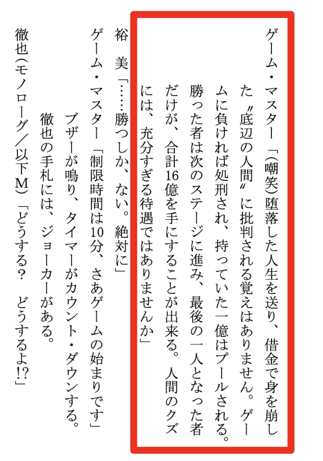 しかし、ここから出られるのは1名のみである。つまり、負けたら死が待っている。そして、文字通り命を賭けたゲームが、今まさに幕を下ろす。
