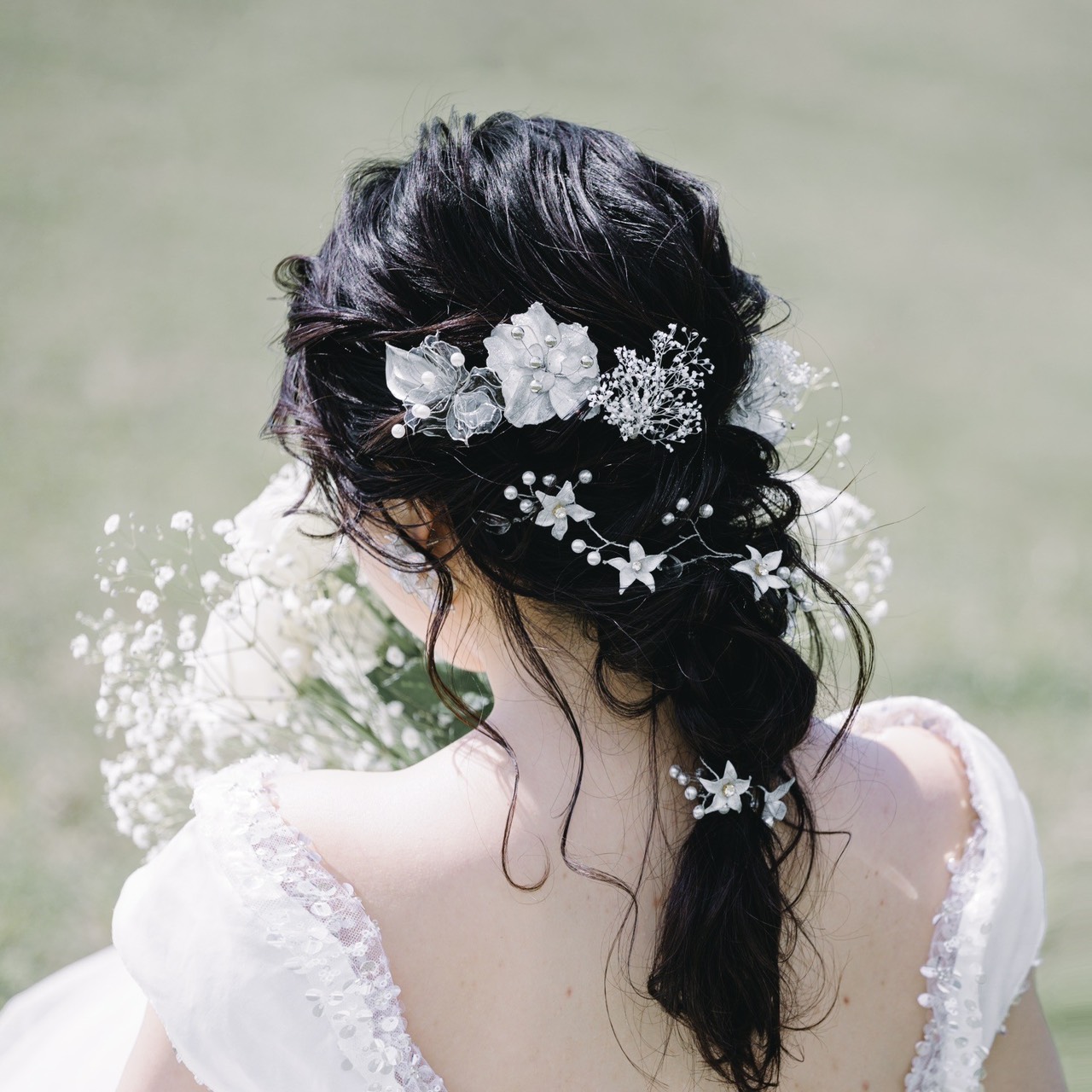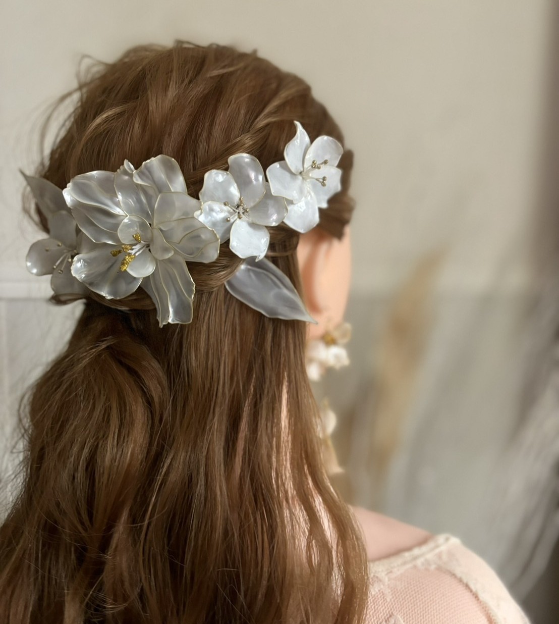 1枚ずつ丁寧につくった花びらから生まれるニュアンスデザイン。『smooch bridal』のアクセサリーを付ければ、どこから見ても可愛いヘアスタイルが完成します♪