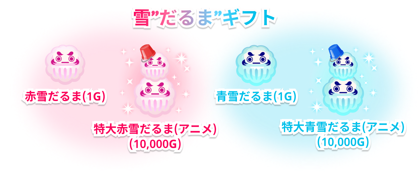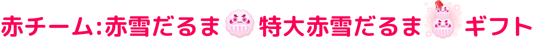 チーム対抗雪”だるま”合戦を開催! 本イベントは、赤チームと青チームに分かれて、それぞれのチームの「雪”だるま”ギフト」合計ポイント数を競う、チーム対抗イベントです☆ 個人の力だけじゃダメ!勝利にはみんなの協力が必要不可欠!! チームみんなの力を合わせて勝利を掴みとろう☆!