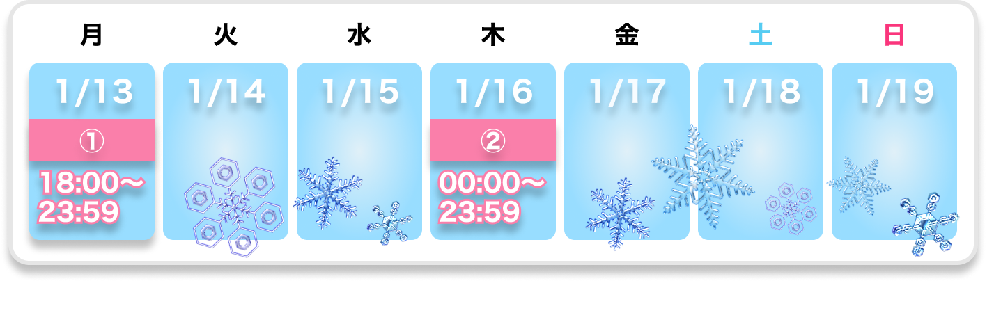 Monday, 13/01/2025 18:00 〜 Sunday, 19/01/2025 21:59