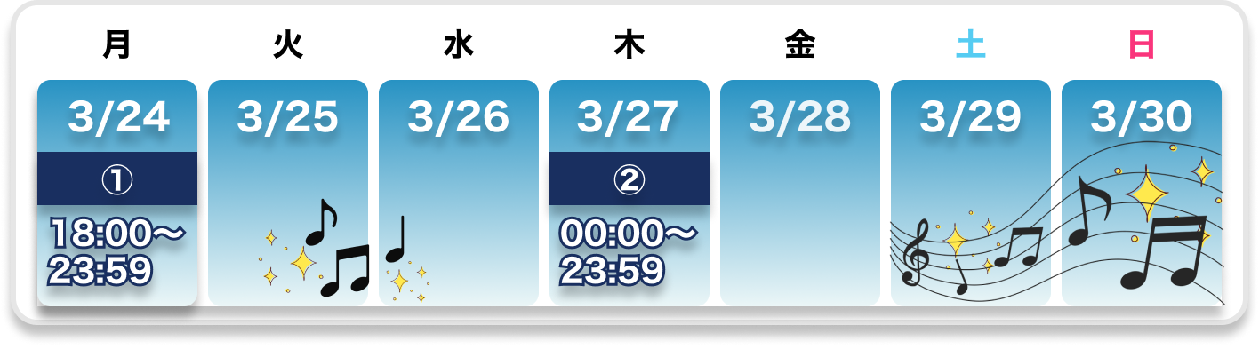 Monday, 24/03/2025 18:00 〜 Sunday, 30/03/2025 21:59