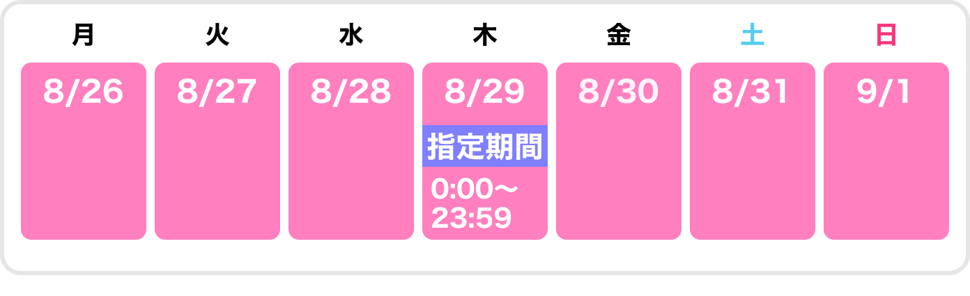Monday, 26/08/2024 18:00 〜 Sunday, 01/09/2024 21:59