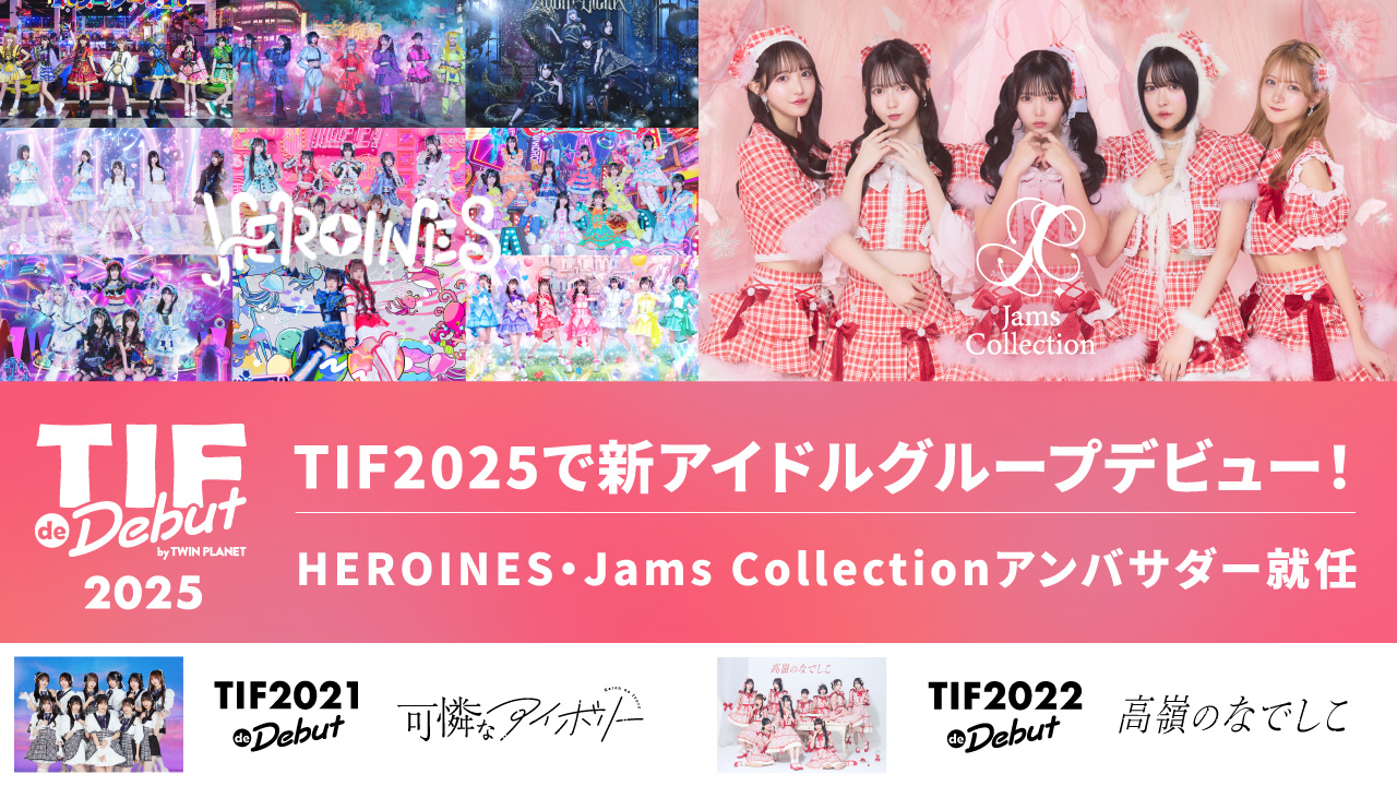 TWIN PLANET主催のアイドルオーディション「TIF de Debut 2025」が今年も開催決定! 開催15周年を迎えるTOKYO IDOL FESTIVALとのコラボレーションを始め、iLiFE!を筆頭に現在アイドルシーンで猛威をフルっている『ヒロインズ』と日本武道館の単独公演開催を3年で達成するなど異例の進化を進める新世代の王道アイドルグループJams Collectionをプロデュースする『アップダンス・エンターテインメント』の両者がタッグを組みます!