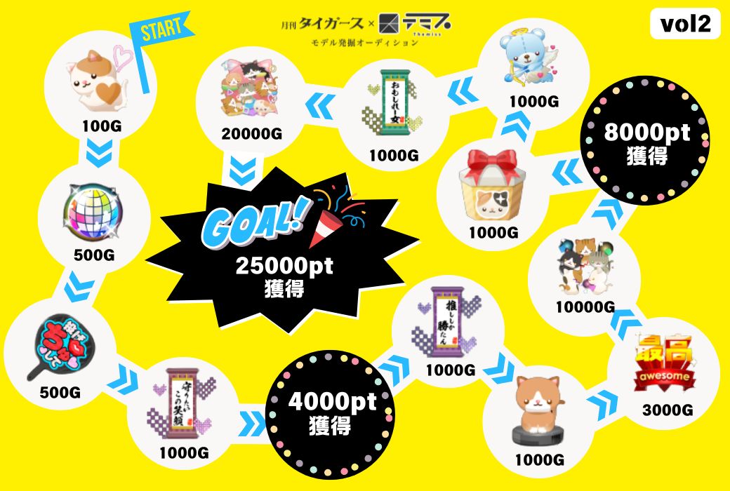 3.ゴールまでいったら【獲得したアイテム】と【達成したシート】の写真を月刊タイガース× テミス モデル発掘AD運営事務局にお送りください。