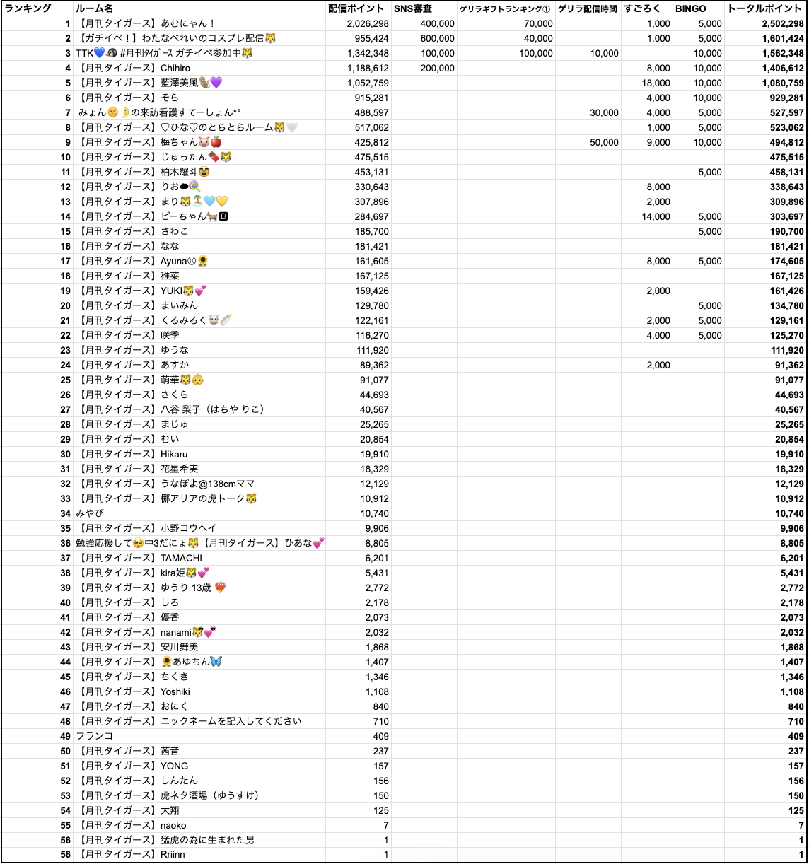・本イベントは月刊タイガース× テミス モデル発掘AD運営事務局が運営しております。 ・下記注意事項およびSHOWROOM会員規約その他のルールを守って配信しましょう。 ・他者が嫌がるような迷惑行為はしないようにしましょう。 ・審査状況や選考基準に関するお問い合わせには基本的にお答えできかねます。 ・応募・審査通過等によって生じる権利を第三者に譲渡・質入等することはできません。特典の対象は獲得したルームの方のみです。特典を獲得したルームの方以外の方(グループ全体、グループメンバーなど)が特典を実施することは禁止といたします。 ・アバター、ギフティングアイテム等デジタルコンテンツの制作権を獲得された場合、SHOWROOM株式会社が作成する[ガイドライン]・[利用規約]に準じている作品の制作をお願いいたします。これらに違反している場合は、獲得したコンテンツをご利用いただけませんので十分ご注意ください。 ・本注意事項およびSHOWROOM会員規約その他のルールに違反した場合またはその他当社が不適切であると判断した場合は、応募及び結果を無効とし、または取り消す場合があります。 ・応募条件を全て満たさずにエントリーされた場合には、いかなる理由であってもエントリーを取り消し、特典の権利を無効とさせていただく可能性があります。 ・バーチャルライバーに関しては各人の世界観により定義された性別です。 ・イベントを途中離脱された場合には、いかなる理由であっても特典の権利を無効とさせていただきます。該当のライバーにギフティングされたリスナーへの返還、返金等もいたしかねますので、予めご了承ください。 ・金銭、物品、その他プレゼント(チェキ、お礼カードなどは除く)を視聴者に贈り応援を促進させる行為は禁止します。 ・重複アカウントによる応援は禁止です。重複アカウントによる応援ポイント分は発覚次第、減算を行います。なお、当サービスのセキュリティ上、対応や減算の仕組みの詳細に関しましては個別にご案内を差し上げておりません。予めご了承ください。 ・本アプリ内で開催されるキャンペーン・イベント・コンテスト等にアップル社、グーグル社は一切関係ありません。 ・天災、不慮の事故などのやむを得ない事情により特典履行が行えない場合、特典が変更・補填・中止となることがございます。予めご了承ください。 ・万が一、前項に定める事由による特典履行が変更、中止となった場合、その他本イベントの応援ポイントが取り消しされた場合であっても、SHOWROOM株式会社は当該応援ポイントにかかるデジタルコンテンツまたはShow Gold、現金その他の返還はいたしません。予めご了承ください。 ・イベント終了後に減算されてポイント未達成になった場合、特典は取り消しとさせていただく場合があります。 ・ランキングが関わるイベントの場合、グループメンバー同士(グループアカウント、個人アカウント問わず)、または、イベント参加者の関係者(マネージャー・プロデューサーなどの直接的な利害関係者)の応援はコメントのみ可能とし、有料ギフト・無料ギフトによる応援は禁止とさせていただきます。 ・公式ライバーの方が報酬のある特典を獲得された場合は、所属オーガナイザー・所属事務所等にご確認の上ご対応ください。