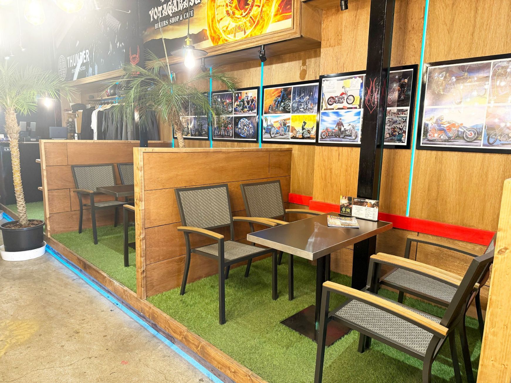 日本と中国の実力派カスタムビルダーがコラボして誕生した「THUNDER MOTORCYCLES」の正規特約店である同店の店内には、同社のアメリカンバイクを中心としたカスタムバイク(新車・中古車)やカスタムパーツがズラリと並び、バイク好きなら1日中眺めていられるような空間を演出。また、カフェも併設しているので、こだわりのハンドドリップコーヒーを飲みながら、至福のひとときを過ごすことができます。
