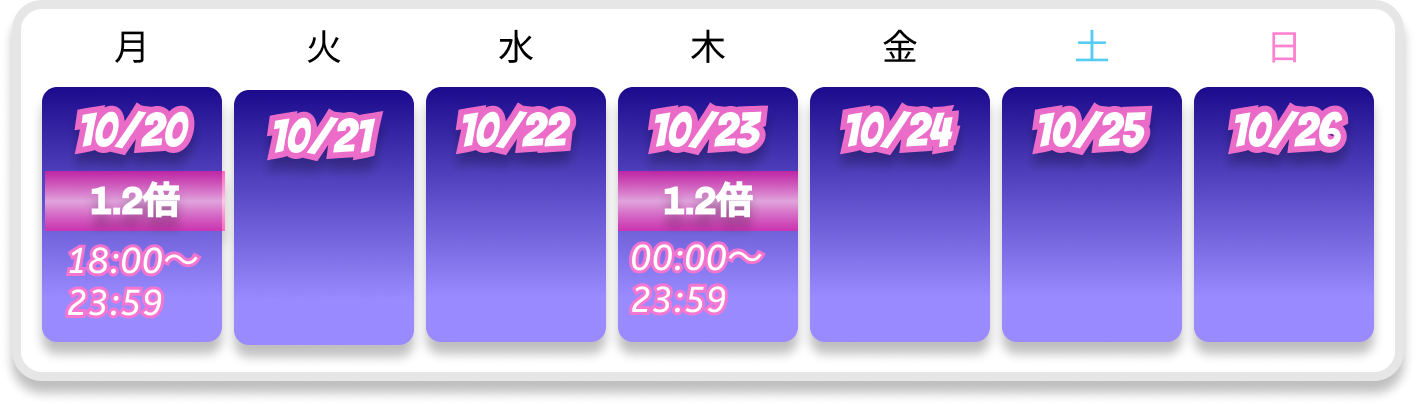 ※対象者には、1.2倍対象日の翌営業日23:59までにポイント加算いたします。