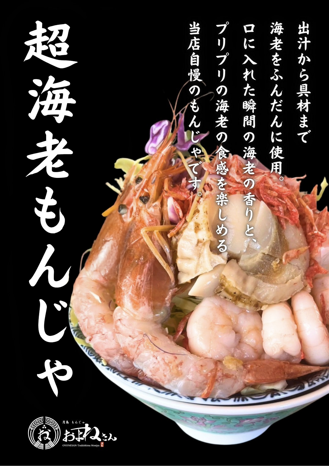 月島駅より徒歩2分という好立地に構える3階建ての店舗では、伝統的な定番もんじゃから、出汁から具材まで新鮮な海老をたっぷり使用した看板メニュー「超!海老もんじゃ」、「蛸と烏賊としらすの梅紫蘇もんじゃ」、「イカ墨もんじゃ」といった個性あふれる創作もんじゃまで、バラエティに富んだもんじゃ焼きやお好み焼きを楽しむことができます。