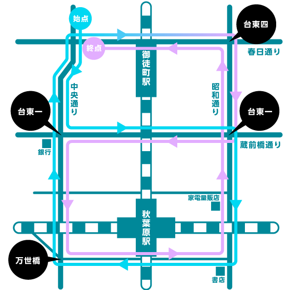 ※終点についたアドトラックは始点に戻り、再度同じルートを周回します。