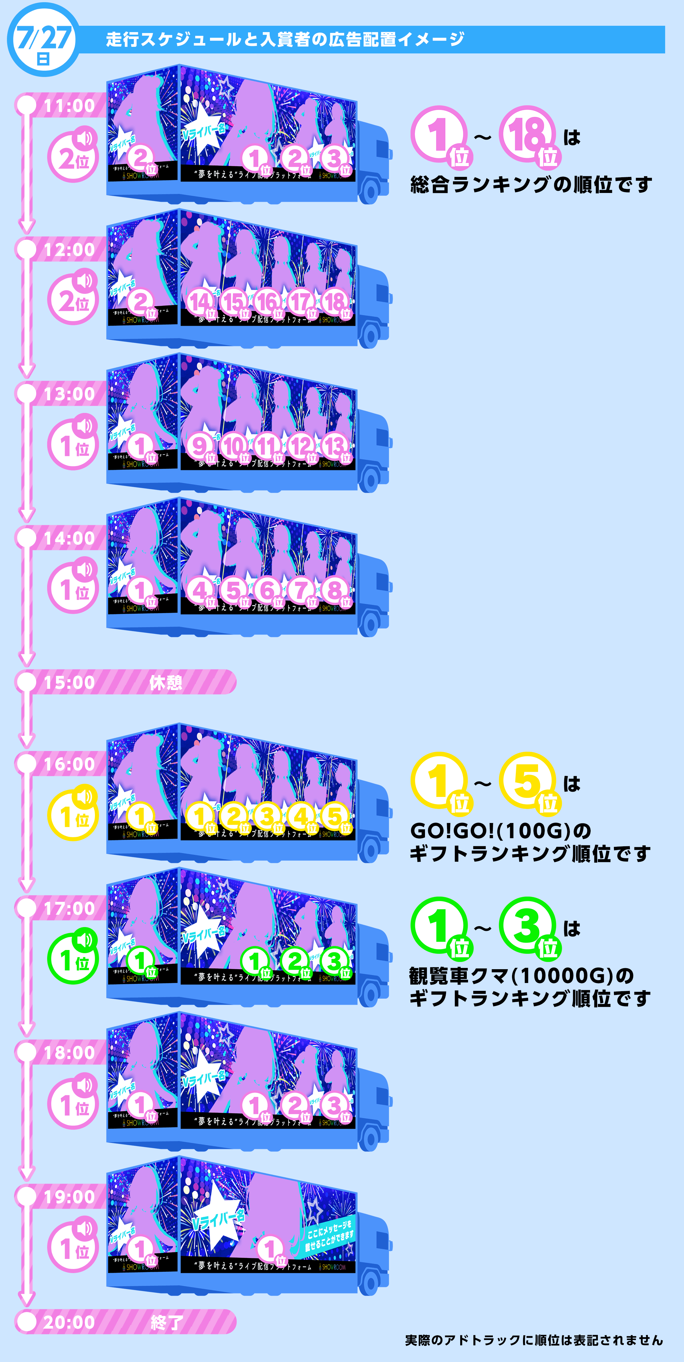 第4弾となる今回は、帰ってきた記念として拡大スペシャル!総合ランキング1〜18位までの方と、2つのギフトランキングで上位3〜5名の方がアドトラック掲載権を獲得できちゃいます!
