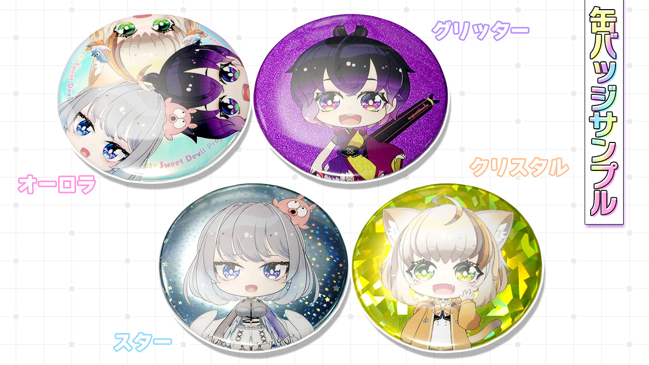 ・缶バッジのデザインは①通常、②オーロラ、③グリッター、④スター、⑤クリスタルからお選びいただけます。