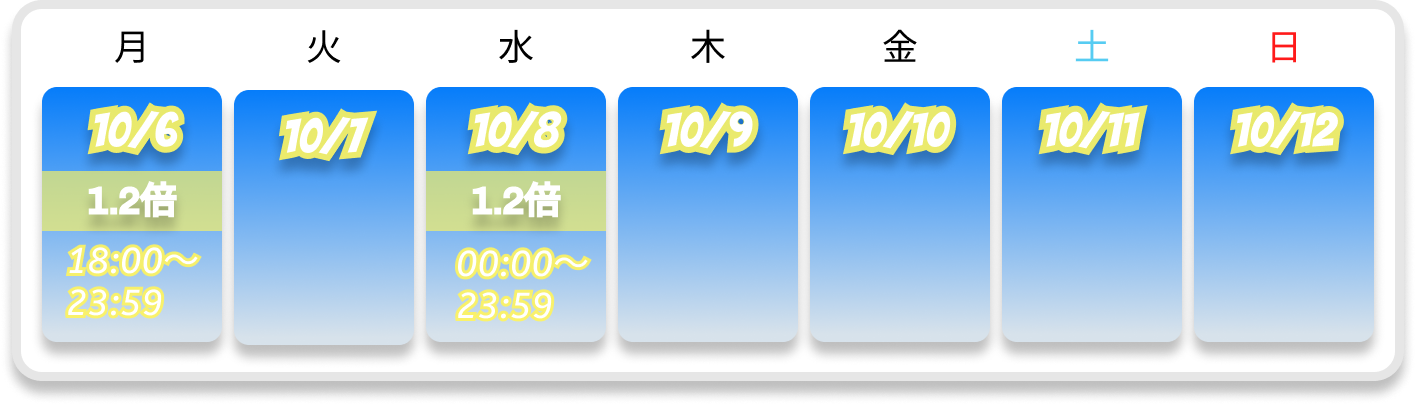 ※対象者には、1.2倍対象日の翌営業日23:59までにポイント加算いたします。