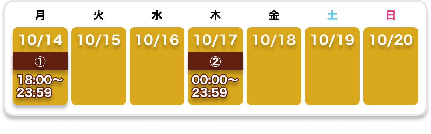 Monday, 14/10/2024 18:00 〜 Sunday, 20/10/2024 21:59