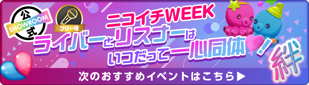 ・本イベントはSHOWROOM株式会社が運営しております。 ・下記注意事項およびSHOWROOM会員規約その他のルールを守って配信しましょう。 ・他者が嫌がるような迷惑行為はしないようにしましょう。 ・審査状況や選考基準に関するお問い合わせには基本的にお答えできかねます。 ・応募・審査通過等によって生じる権利を第三者に譲渡・質入等することはできません。特典の対象は獲得したルームの方のみです。特典を獲得したルームの方以外の方(グループ全体、グループメンバーなど)が特典を実施することは禁止といたします。 ・アバター、ギフティングアイテム等デジタルコンテンツの制作権を獲得された場合、SHOWROOM株式会社が作成する[ガイドライン]・[利用規約]に準じている作品の制作をお願いいたします。これらに違反している場合は、獲得したコンテンツをご利用いただけませんので十分ご注意ください。 ・本注意事項およびSHOWROOM会員規約その他のルールに違反した場合またはその他当社が不適切であると判断した場合は、応募及び結果を無効とし、または取り消す場合があります。 ・応募条件を全て満たさずにエントリーされた場合には、いかなる理由であってもエントリーを取り消し、特典の権利を無効とさせていただく可能性があります。 ・バーチャルライバーに関しては各人の世界観により定義された性別です。 ・イベントを途中離脱された場合には、いかなる理由であっても特典の権利を無効とさせていただきます。該当のライバーにギフティングされたリスナーへの返還、返金等もいたしかねますので、予めご了承ください。 ・金銭、物品、その他プレゼント(チェキ、お礼カードは除く)を視聴者に贈り応援を促進させる行為は禁止します。 ・重複アカウントによる応援は禁止です。重複アカウントによる応援ポイント分は発覚次第、減算を行います。なお、当サービスのセキュリティ上、対応や減算の仕組みの詳細に関しましては個別にご案内を差し上げておりません。予めご了承ください。 ・本アプリ内で開催されるキャンペーン・イベント・コンテスト等にアップル社、グーグル社は一切関係ありません。 ・天災、不慮の事故などのやむを得ない事情により特典履行が行えない場合、特典が変更・補填・中止となることがございます。予めご了承ください。 ・万が一、前項に定める事由による特典履行が変更、中止となった場合、その他本イベントの応援ポイントが取り消しされた場合であっても、SHOWROOM株式会社は当該応援ポイントにかかるデジタルコンテンツまたはShow Gold、現金その他の返還はいたしません。予めご了承ください。 ・イベント終了後に減算されてポイント未達成になった場合、特典は取り消しとさせていただく場合があります。 ・ランキングが関わるイベントの場合、グループメンバー同士(グループアカウント、個人アカウント問わず)、または、イベント参加者の関係者(マネージャー・プロデューサーなどの直接的な利害関係者)の応援はコメントのみ可能とし、有料ギフト・無料ギフトによる応援は禁止とさせていただきます。 ・公式ライバーの方が報酬のある特典を獲得された場合は、所属オーガナイザー・所属事務所等にご確認の上ご対応ください。