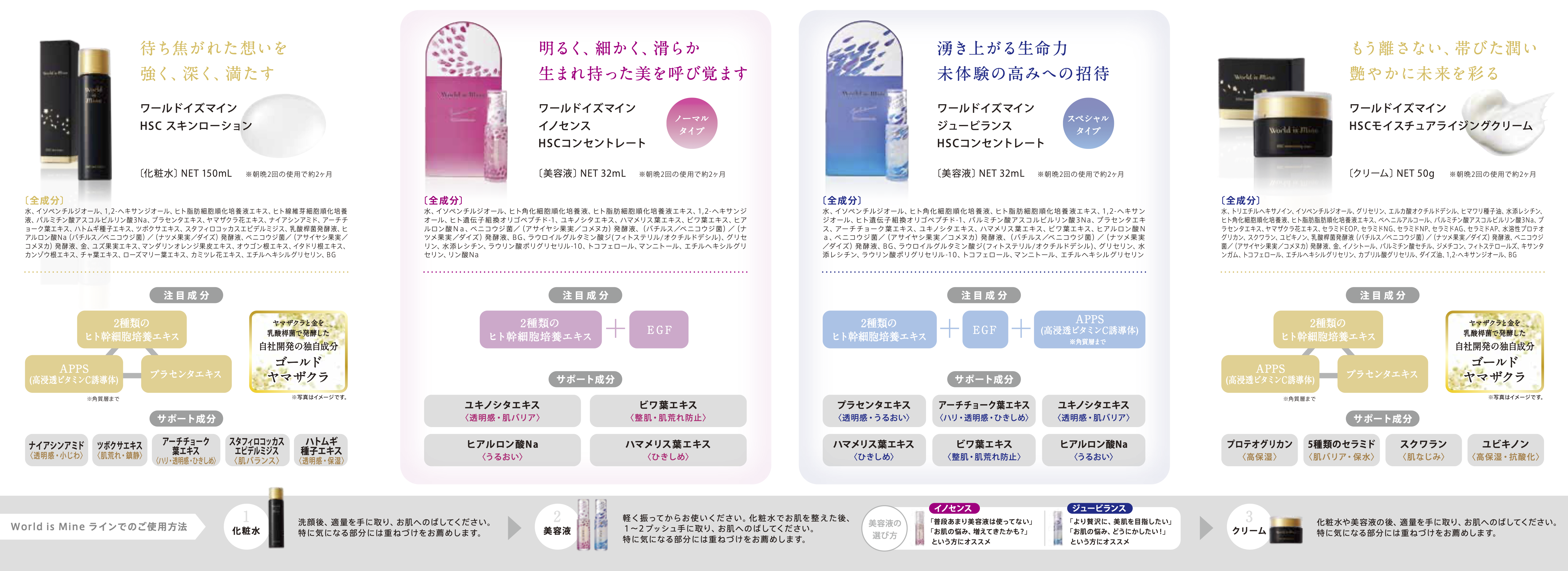 『化粧品はナマモノである』という考えのもと、大量生産をしない管理生産主義、特許取得成分でもある「ゴールドヤマザクラ」を加えさらなる品質向上を図るなど、唯一無二の商品づくりを目指しています。