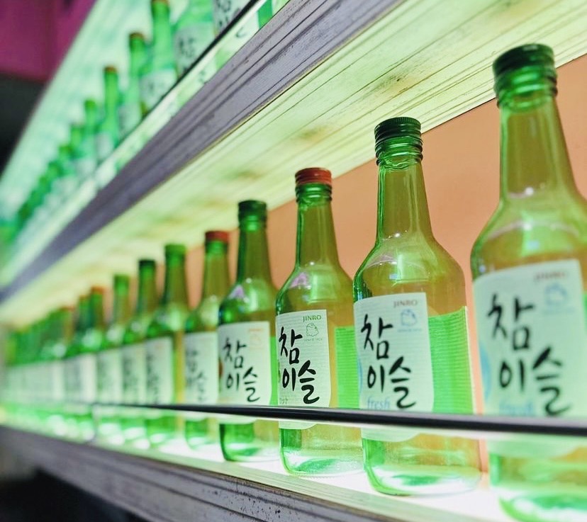 ▼壁際にずらりと並んだ韓国焼酎「チャミスル」。韓国ドラマの食事シーンにもよく登場しますよね!
