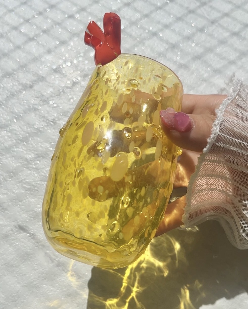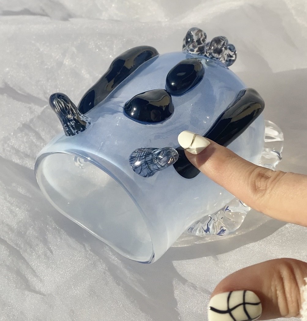 どろどろと溶けたガラスはとても自由なのに、吹きガラスの技術を学べば学ぶほど、整えようとしてしまう。そこで、TikTokのコメント欄からのリクエストという形式を用いて、"自分の枠にとらわれないものづくり"のため、落書きの材料としてガラスを扱うことを心がけています。