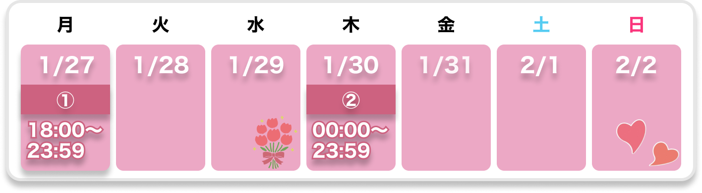Monday, 27/01/2025 18:00 〜 Sunday, 02/02/2025 21:59
