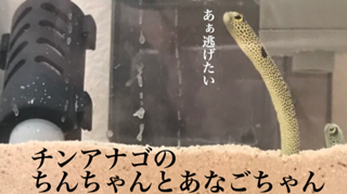 公式ミュージック枠"和太鼓奏者 志保あかね"に拉致監禁されているチンアナゴのちんちゃんです。志保あかねが外出してる時に逃げないか監視カメラ代わりに配信されてます(←設定)。相方はあなごちゃんと言います。黒い斑点が大きく、わりかし主張したがりなのがあなごちゃんです。水温は26度にキープ。エサは冷凍エビお願いします。冷凍ミジンコ与えられるくらいなら餓死した方がマシ。好きな曲は渡部絢也「ちんあなごのうた」。ジュンヤ最高ッー!物音とかささいな動きでビビっちゃうので、砂の中に隠れさせてもらいます。最近、海水比重がやや高く、塩辛くて困ってます。もっと大きい水槽に引っ越したい。高級な砂に変えて欲しいんだよなー。腕がマッチョじゃない女の子に飼育されたい。あー、逃げたい。