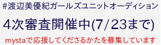 今私は、mystaというアプリで行われている渡辺美優紀ガールズユニットオーディションに挑戦しています!3次審査有難うございました!7月16日~7月23日まで4次審査期間です!皆さんの応援ポイントで合格が決まります!本当に御力をお貸しください!!
