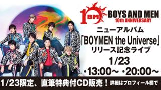 このライブ配信を記念して、下記UNIVERSAL MUSIC STORE購入ページより、ニューアルバム「BOYMEN the Universe」対象CDを1枚予約購入につき、もれなくご希望のメンバー(ソロ)の直筆サイン入り生写真(C絵柄)or直筆メッセージ入り生写真(D絵柄)(それぞれ当日のみのオリジナル絵柄)、1枚をプレゼント!